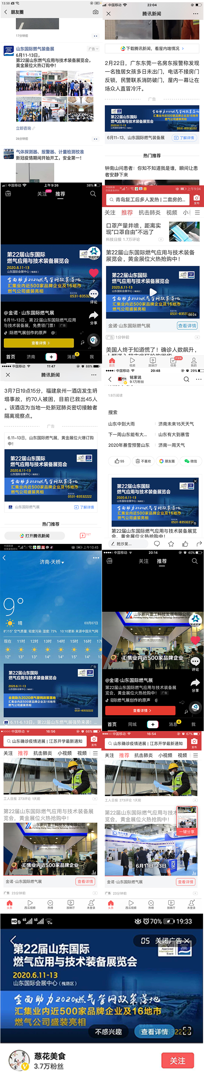 山東6月11~13日國(guó)際燃?xì)庋b備展,值22年開展之際,今日頭條、慧聰、騰訊、新浪、新聞?lì)l道、抖音及微信定向等各大網(wǎng)絡(luò)平臺(tái)霸屏中!