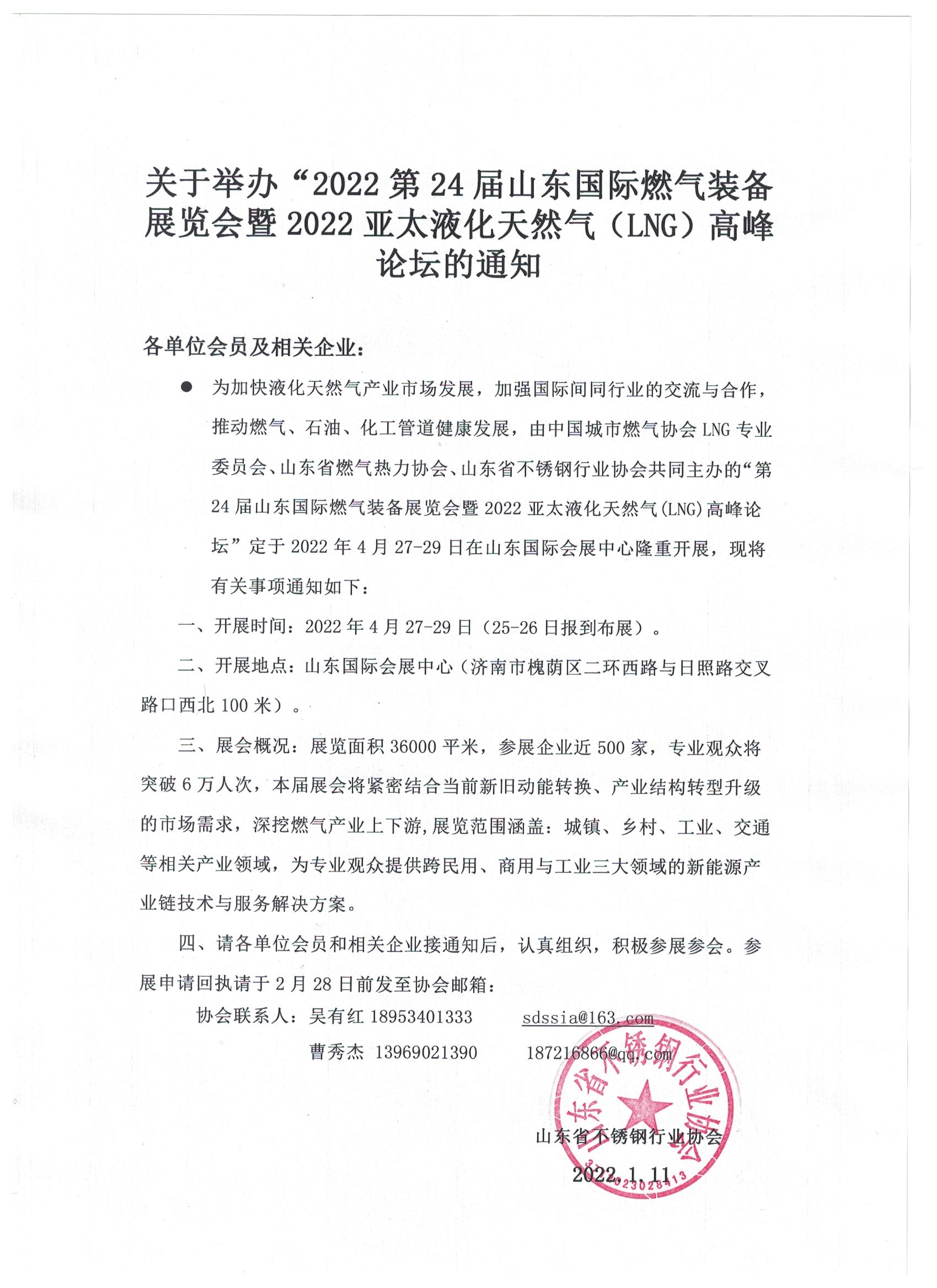 關(guān)于舉辦“2022第24屆山東國際燃?xì)庋b備展覽會暨2022亞太液化天然氣(LNG)高峰論壇