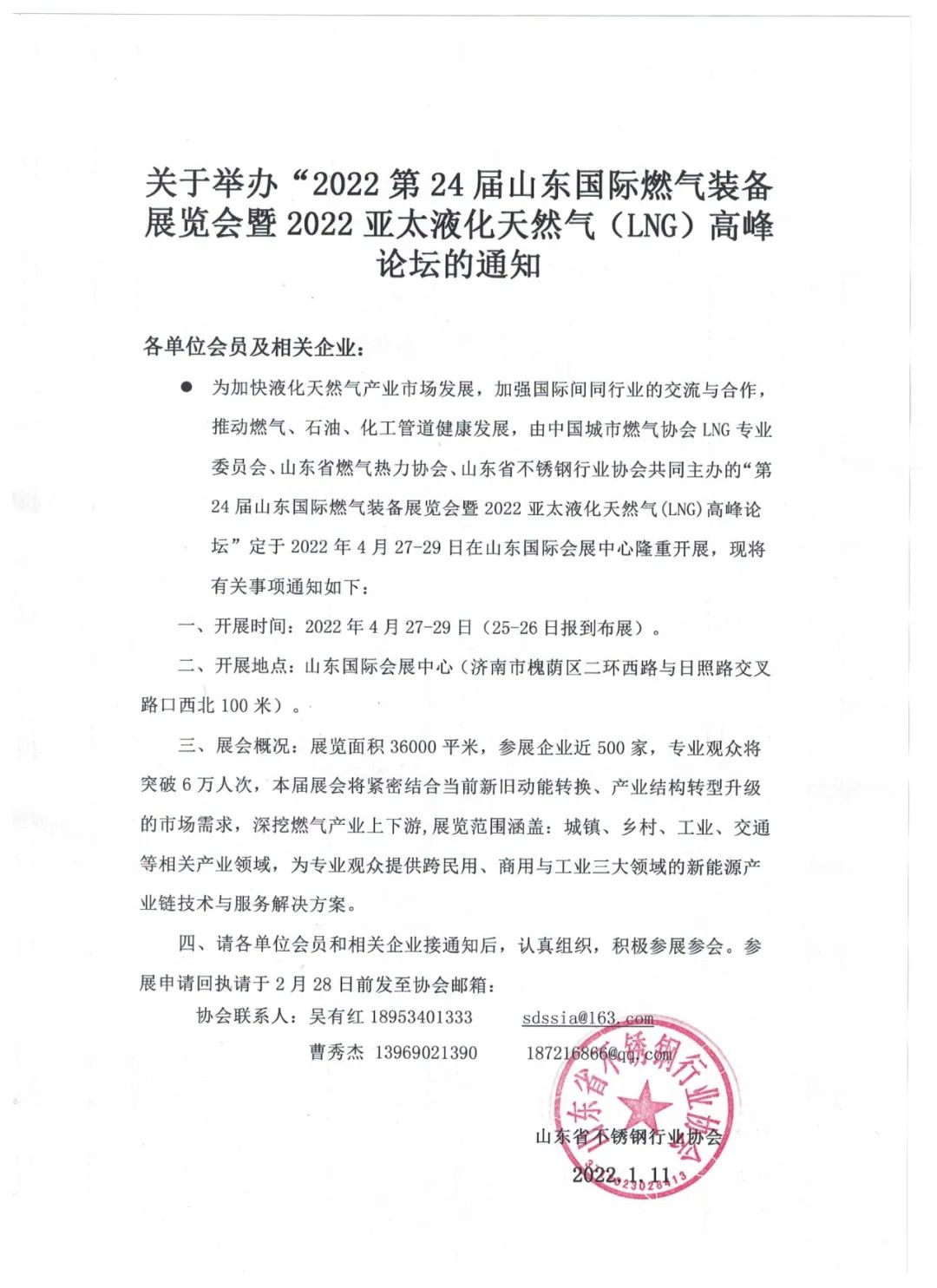 盛會在即,山東省不銹鋼行業(yè)協(xié)會邀您參加2022第24屆山東國際燃?xì)庋b備展